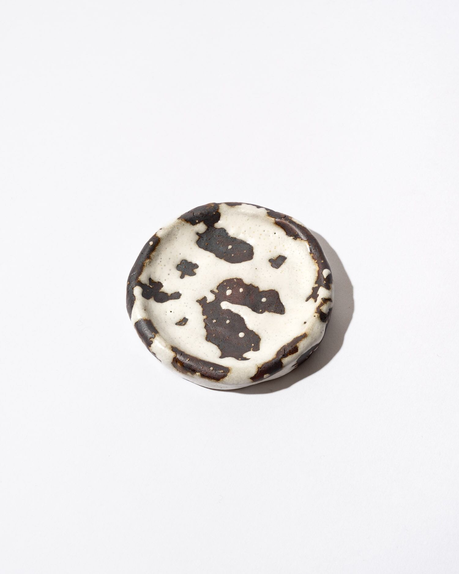 鬼萩という技法を使って作成したe.p studio ハンドメイドのお香皿。鬼萩は実際に荒い砂を混ぜるものですが、こちらは通常の土で作っています。名前とは反し牛柄のような模様に仕上げています。お香皿、セージやパロサントを焚く際などにご使用ください。